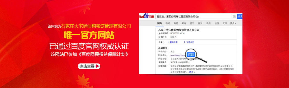 Copyright © 石家莊大宋醉仙鴨餐飲管理有限公司 All Rights Reserved.  技術(shù)支持:河北供求網(wǎng) 河北名企網(wǎng)榮譽企業(yè)-河北企業(yè)名錄已收錄